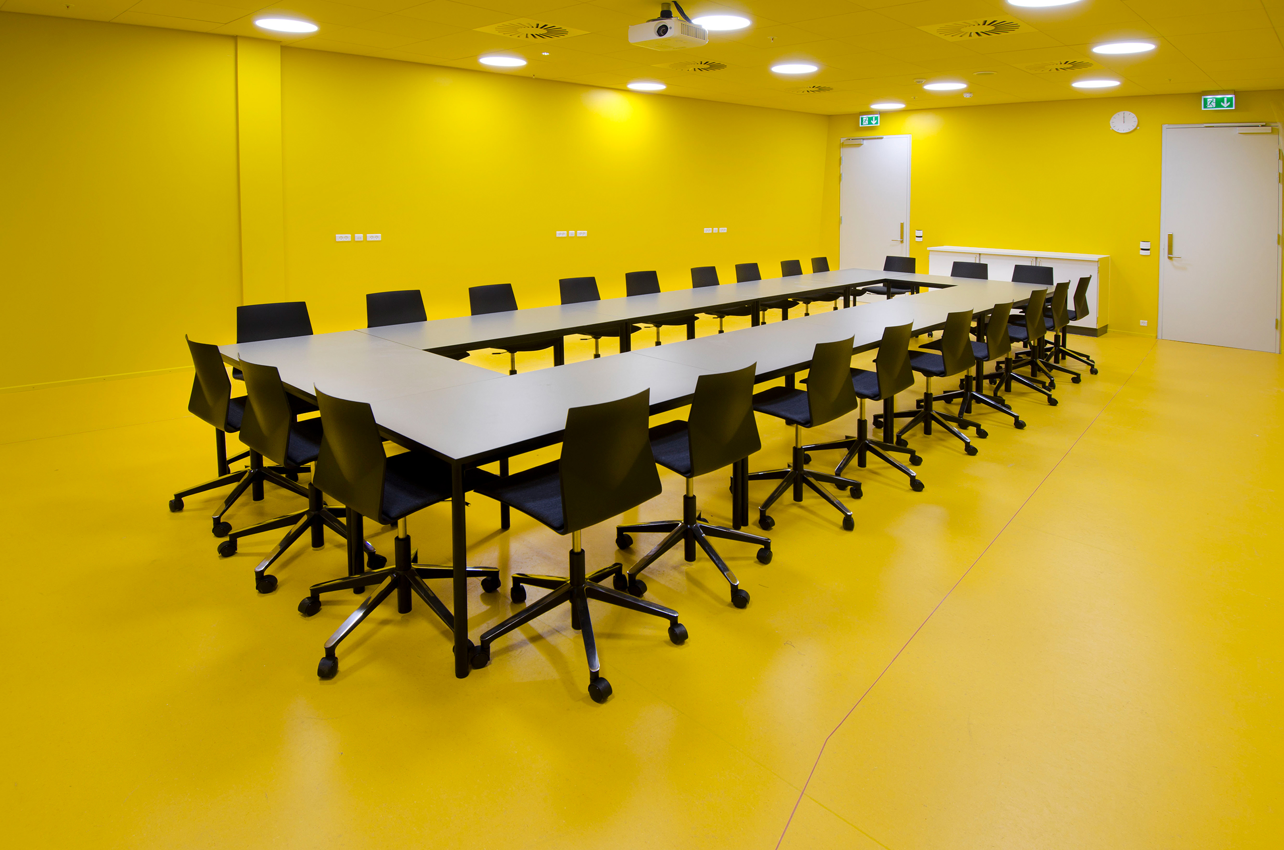 För att passa skolans färgstarka lokaler som exempelvis rum i orange och gult från golv till tak, valdes möbler i grått och svart. Mötesrum inreddes med bordet Active och HideTech med integrerad teknologi direkt i skivan samt kontorsstolar Savo. För förvaring i form av hyllor och skåp intill arbetsstationer användes Create Storage med svart stomme och fronter i trä. De flesta ingenjörsstudenter på skolan har långa arbetsveckor, så det fanns ett behov att skapa loungeytor för välbehövliga pauser vilket man gjorde med stolar, sittpuffar, soffor och pelarbordet Chat.